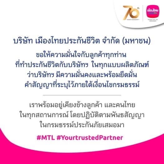 “เมืองไทยประกันชีวิตพร้อมอยู่เคียงข้างผู้เอาประกันภัย ตลอดจนคนไทยในทุกสถานการณ์ และปฏิบัติตามพันธสัญญาในกรมธรรม์ประกันภัยเสมอ”