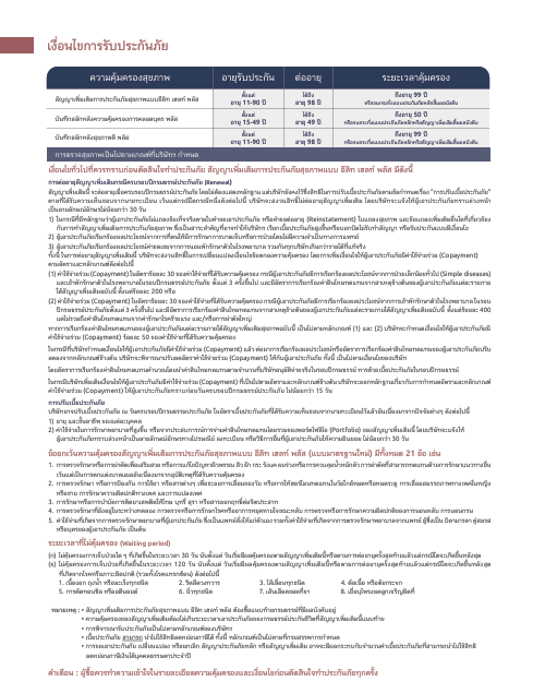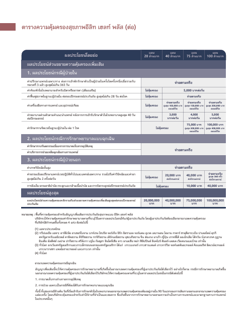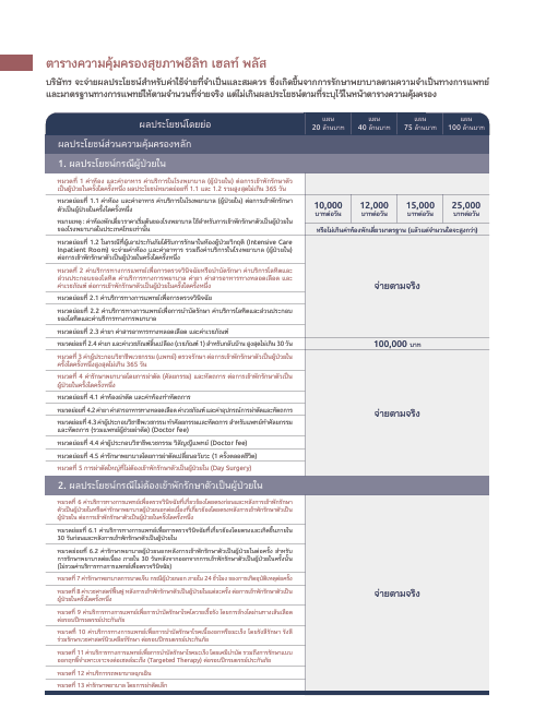 รายละเอียดผลประโยชน์ในประกาศคำสั่งนี้ เป็นเพียงการสรุปโดยย่อเท่านั้น ซึ่งการพิจารณาจ่ายผลประโยชน์ในกรณีต่างๆ ขึ้นอยู่กับเงื่อนไขความคุ้มครอง คำจำกัดความ และข้อยกเว้น ตามสัญญาเพิ่มเติมการประกันภัยสุขภาพ แบบ อีลิท เฮลท์ พลัส