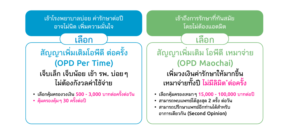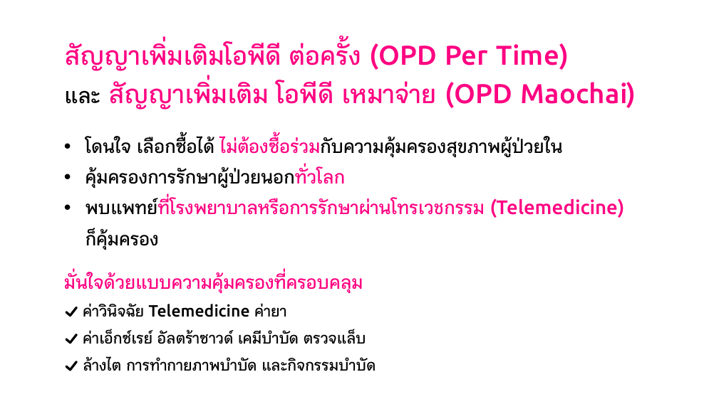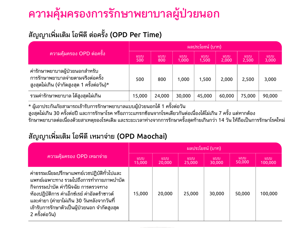 บริษัทจะจ่ายผลประโยชน์ความคุ้มครอง ค่ารักษาพยาบาลผู้ป่วยนอก สำหรับการบาดเจ็บหรือการป่วยที่ผู้เอาประกันภัยเข้ารับการรักษาพยาบาล ในแผนกผู้ป่วยนอกหรือในแผนกฉุกเฉินของโรงพยาบาล โดยที่ไม่มีความจำเป็นทางการแพทย์ต้องเข้าพักรักษาตัวเป็นผู้ป่วยใน หรือการรักษาผ่านโทรเวชกรรม (Telemedicine) โดยแพทย์ของโรงพยาบาลหรือแพทย์ของสถานพยาบาลที่บริษัทกำหนดไว้ใน website ของบริษัท ตามความจำเป็นทางการแพทย์และมาตรฐานทางการแพทย์ สำหรับผลประโยชน์ดังต่อไปนี้