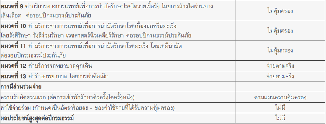 บริษัทจะจ่ายผลประโยชน์สำหรับค่าบริการทางการแพทย์เพื่อบำบัดรักษาในกรณีที่ผู้เอาประกันภัยได้รับการรักษาพยาบาลด้วยรังสีร่วมเพื่อการรักษา รังสีรักษา เวชศาสตร์นิวเคลียร์เพื่อการรักษา (รวมถึงการฝังแร่)ค่ากายภาพบำบัดและกิจกรรมบำบัด ค่าบริการโลหิต ค่าบริการเครื่องมือแพทย์ ค่าบริการกายอุปกรณ์ (ไม่รวมค่าอุปกรณ์) ค่าบริการชุดเหมาจ่ายการรักษาพยาบาลบำบัดการรักษา และค่าบริการทางการพยาบาล แต่ไม่รวมถึงค่าบริการทางการพยาบาลเฝ้าไข้พิเศษ