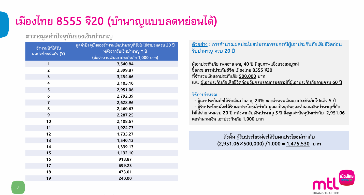 (2) ถ้าผู้เอาประกันภัยเสียชีวิตลงก่อนที่จะด้รับเงินบำนาญครบ 20 ปี บริษัทฯ จะรับรองการจ่ายเงินเป็นจำนวนเดียว ซึ่งเท่ากับมูลค่าปัจจุบันของจำนวนเงินบำนาญที่ยังไม่ไต้จ่ายจนครบ 20 ปี (ตามวิธีการคำนวณที่ระบุไว้ในกรมธรรม์)