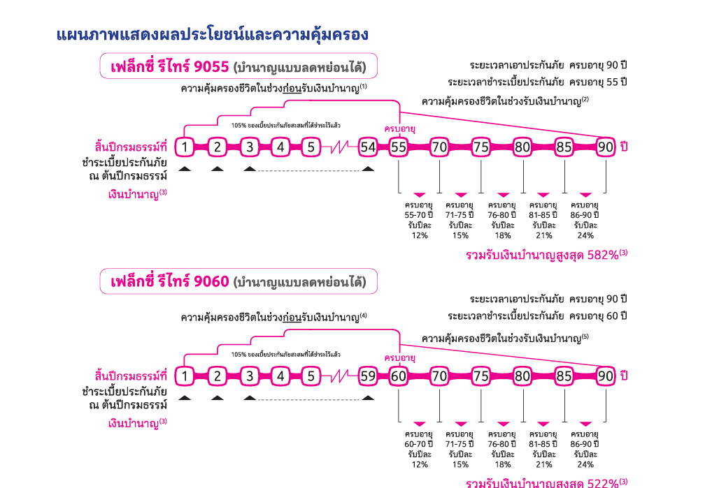 แบบประกันภัยเฟล็กซี่ รีไทร์ 9060 (บำนาญแบบลดหย่อนได้) : 20 ปี – 55 ปี