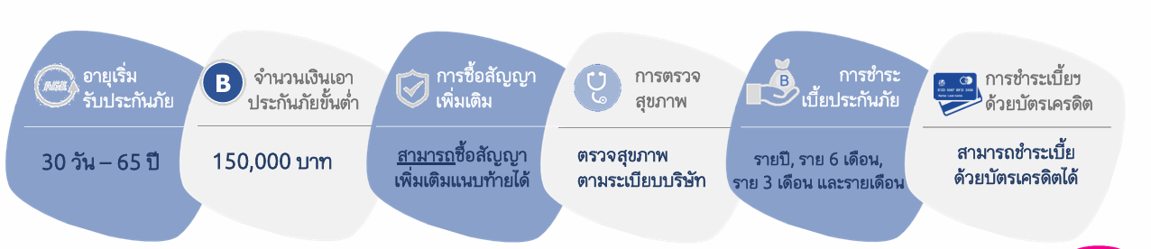 6. การซื้อสัญญาเพิ่มเติมแนบท้าย : สามารถซื้อสัญญาเพิ่มเติมได้ ทั้งนี้เป็นไปตามเงื่อนไขการพิจารณารับประกันของสัญญาเพิ่มเติมนั้น