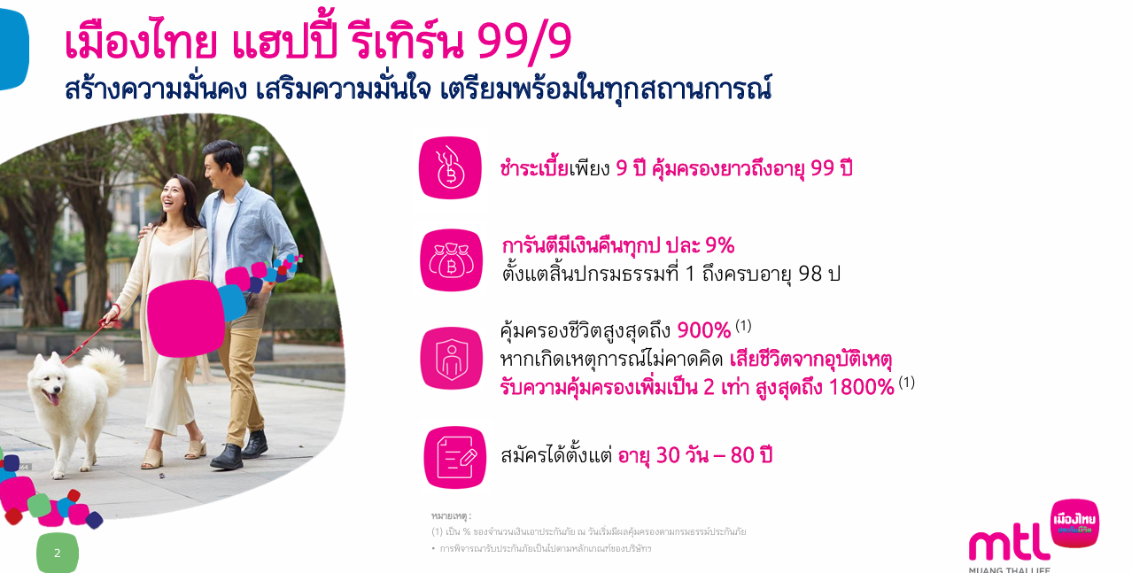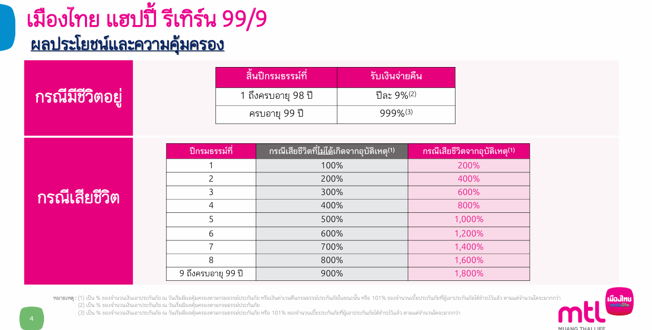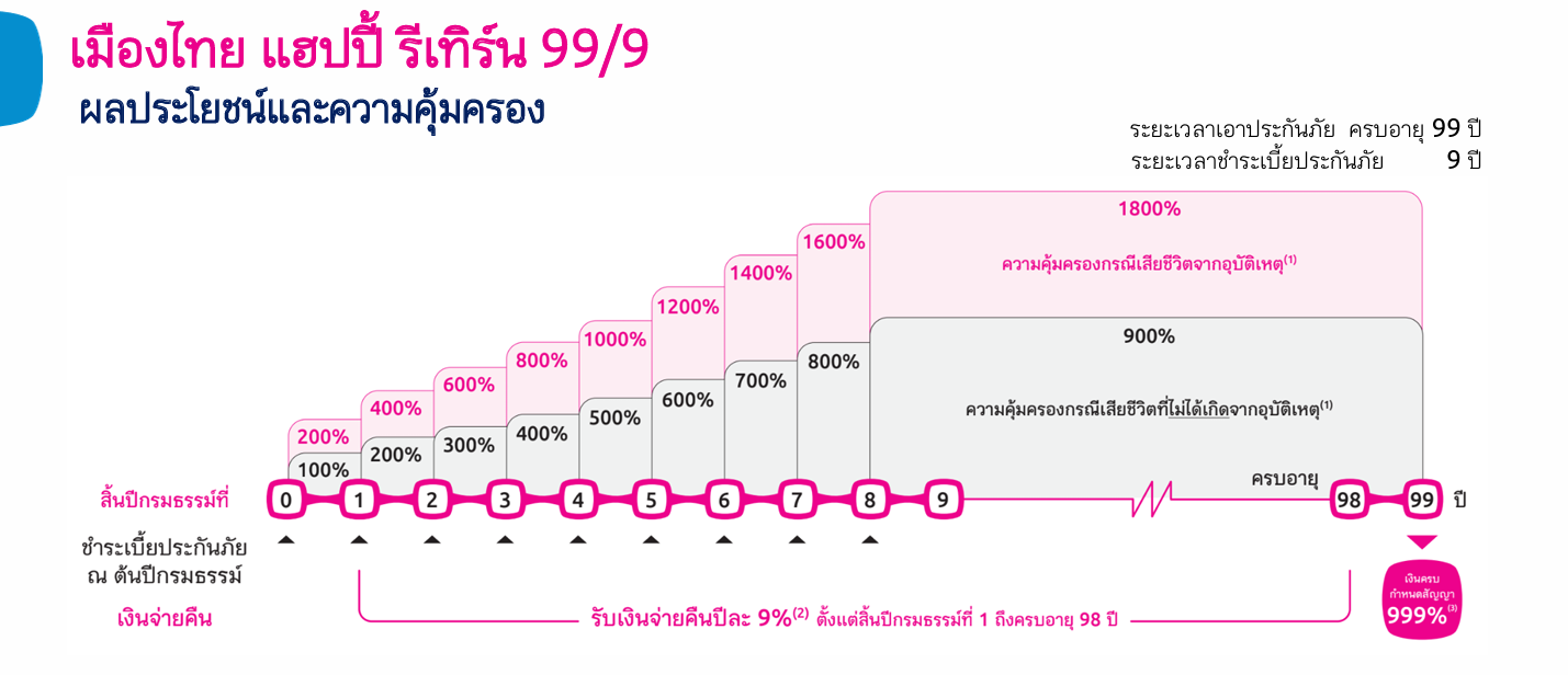 6. ผู้ขอเอาประกันภัยสามารถซื้อแบบประกันภัย เมืองไทย แฮปปี้ รีเทิร์น 99/9 ได้มากกว่า 1 กรมธรรม์ต่อผู้ขอเอาประกันภัยแต่ละคน โดยจำนวนเงินเอาประกันภัยของแบบประกันภัย เมืองไทย แฮปปี้ รีเทิร์น 99/9 ทุกกรมธรรม์ที่ขายผ่านทุกช่องทางต่อผู้เอาประกันภัยแต่ละคนนั้นต้องไม่เกิน 4,000,000 บาท