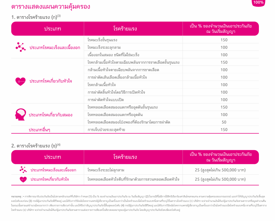 ทั้งนี้เมื่อรวมจำนวนเงินเอาประกันภัยของแบบประกันภัย เมืองไทย ไลฟ์ไทม์ โพรเทคชั่น ทุกกรมธรรม์ กับ สัญญาเพิ่มเติมคุ้มครองโรคร้ายแรงอื่นทุกกรมธรรม์แล้ว